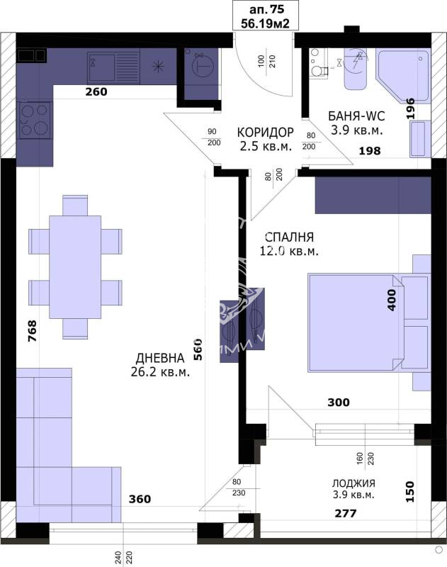 ап. В-75 - 97000 евро / 63.33кв.м. / 2-стаен Юг